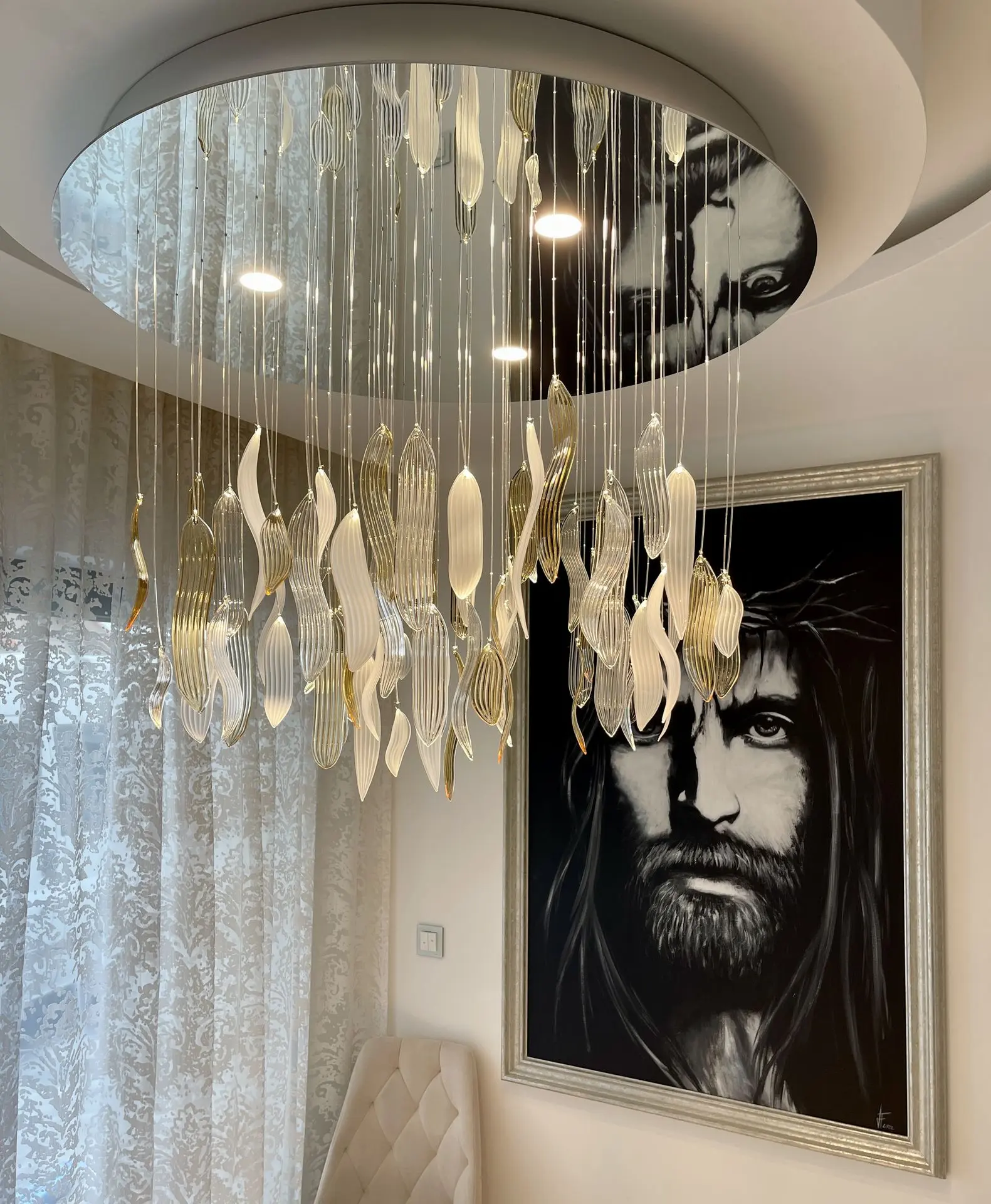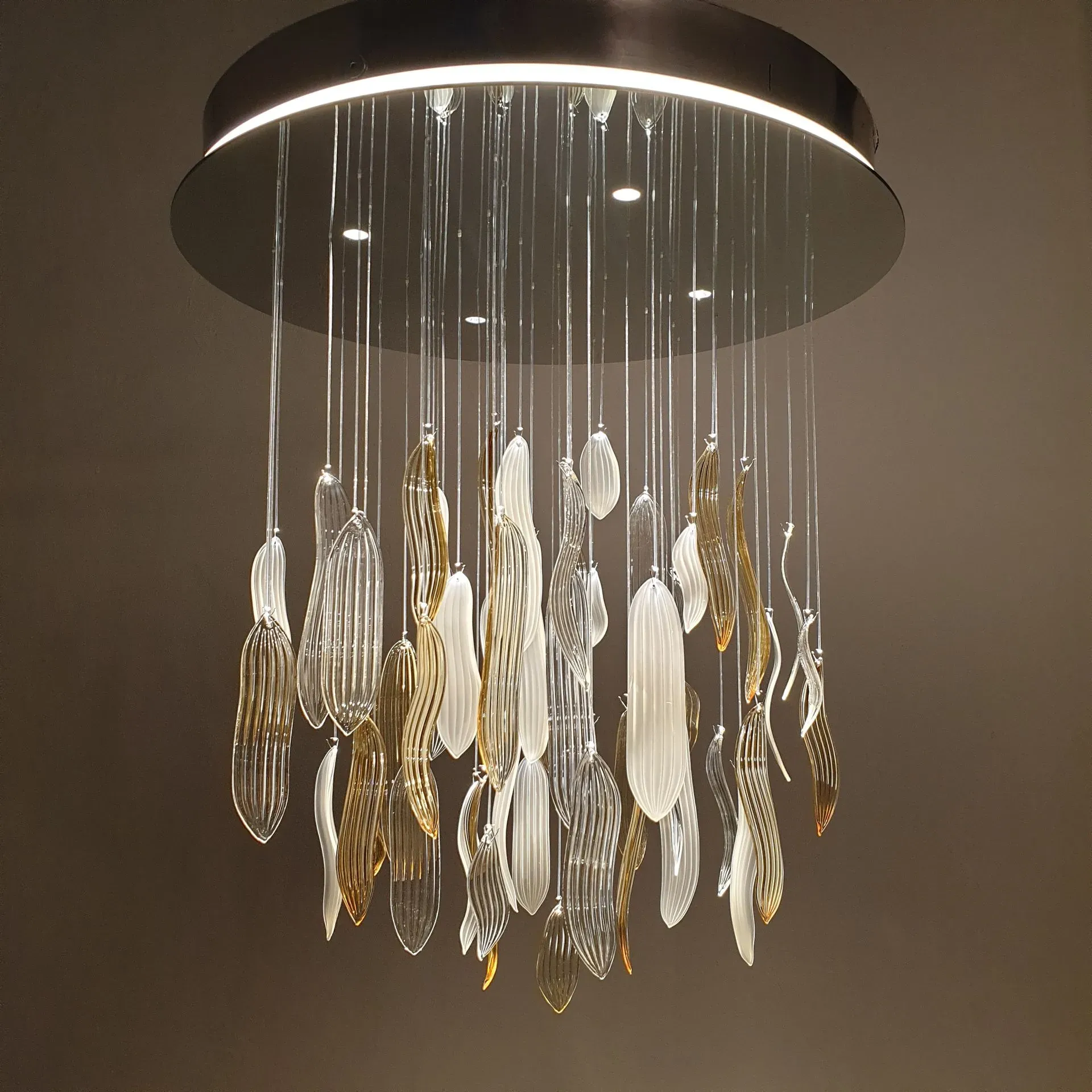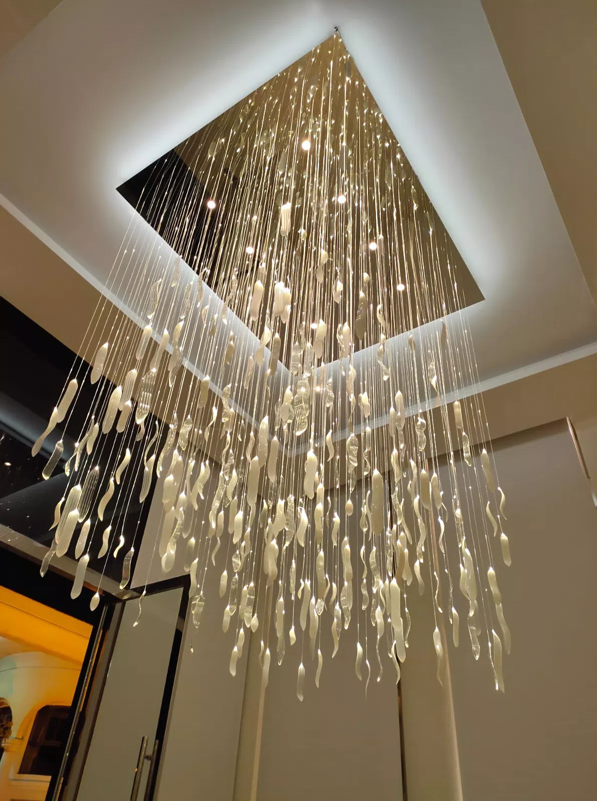 Lustra Aster combină eleganța frunzelor de sticlă boemă cu tehnologia cu fibre optice și LED, creând o simfonie luminoasă ce transformă spațiul. Frunze de sticlă modelate individual sunt suspendate pe fibre optice, iar spoturile LED integrate la bază amplifică distribuția luminii și generează umbre decorative pe podea.