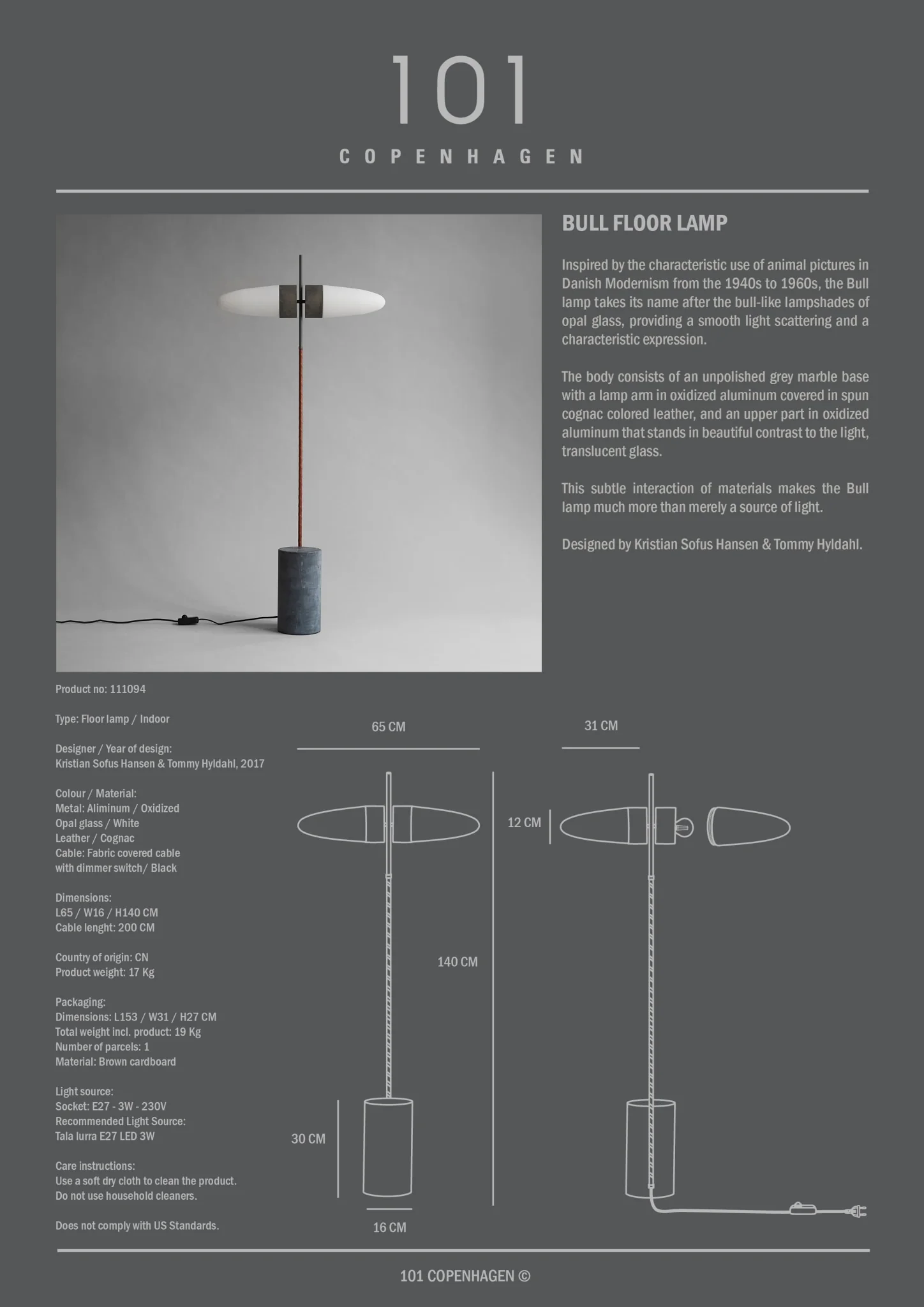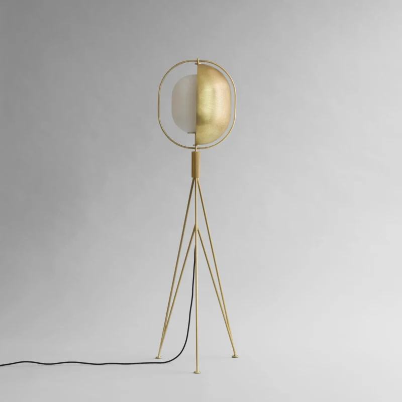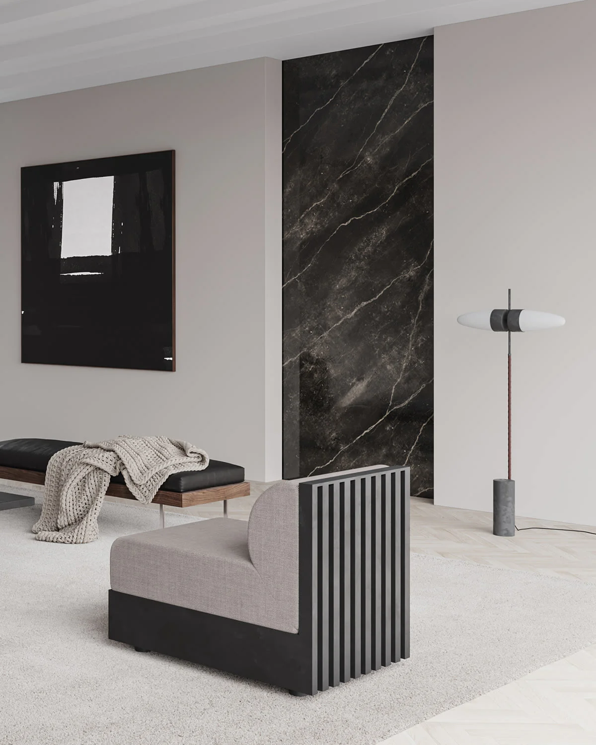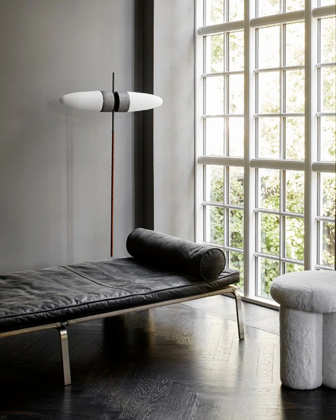 Un corp din aluminiu oxidat ce emană o patină mată, însoțit de un braț înfășurat în piele cognac care însuflețește structura. Baza solidă este realizată din marmură gri neșlefuită, ancorând vizual designul. ⠀