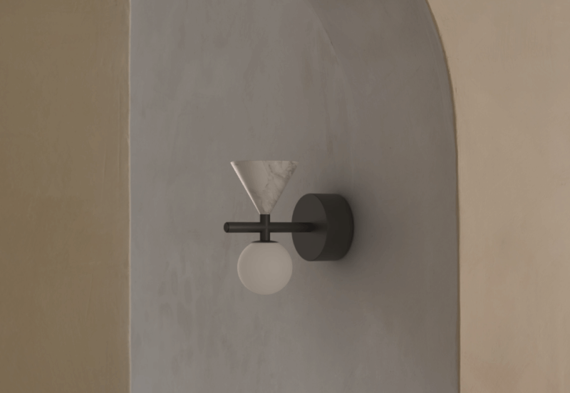 O aplică elegantă, cu linii geometrice și combinații rafinate de metal, sticlă opal și marmură.