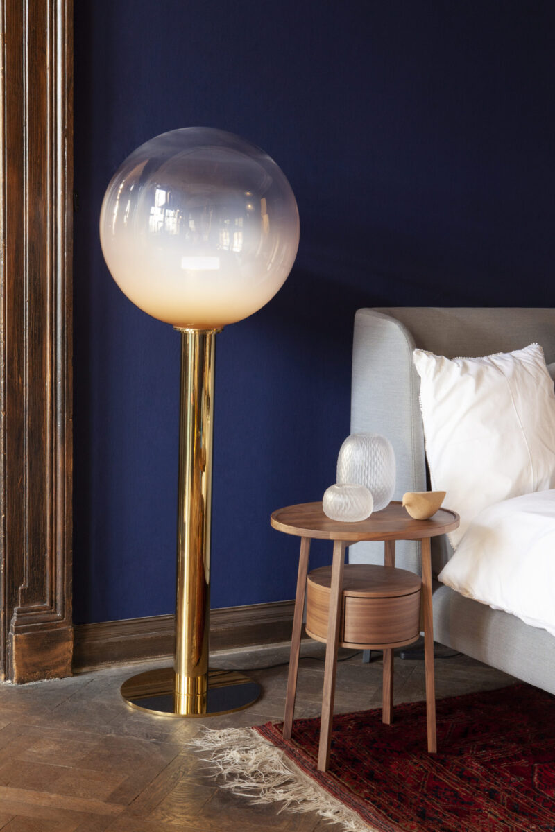 Lampa de podea Dew Drops, concepută de Boris Klimek, îmbină eleganța cristalului suflat manual cu rafinamentul pielii vegane și un strat metalic irizat, generând reflexii sofisticate și jocuri luminoase în spațiu. Înălțimea impunătoare și prezența sa sculpturală transformă acest corp luminos într-o adevărată operă de design pentru ambientul interior.