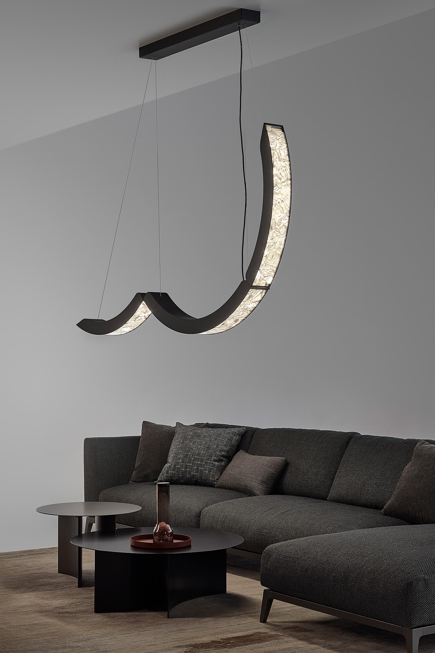 Lampa suspendată ELO, creată de Filippo Mambretti, combină textura distinctă a sticlei BrokisGlass cu un cadru elegant din aluminiu. Cele trei arcade articulate, dintre care două se pot fixa în poziții diferite, permit configurații luminoase personalizate, pentru un efect sculptural dinamic.