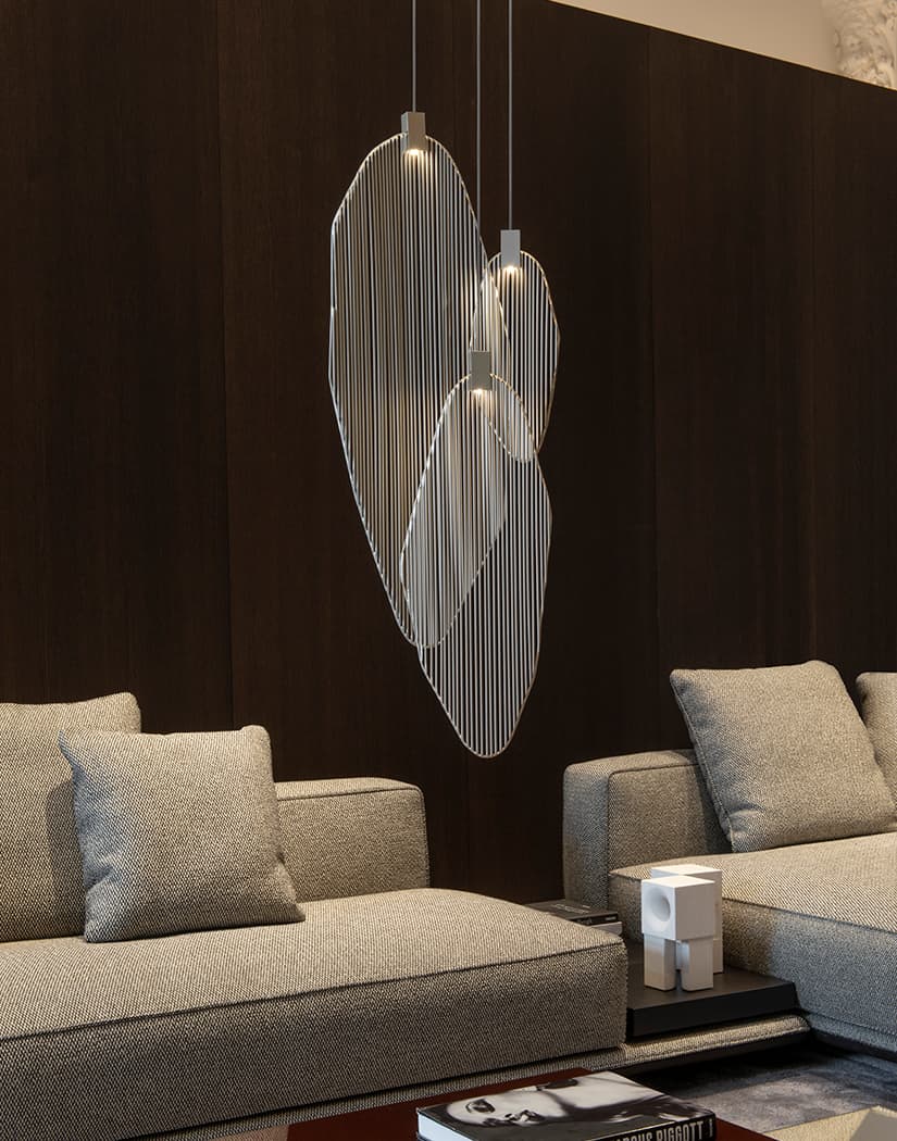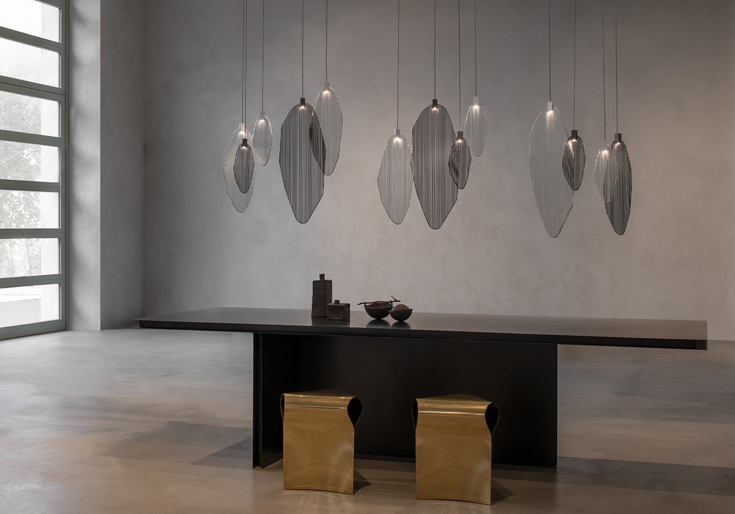 Realizat integral din metal, corpul prezintă tuburi/benzi fine sau „coarde” verticale, care adaugă o expresie sculpturală jocului de lumină și umbră. Lampă suspendată ce poate fi configurată în infinitate de combinaţii şi module, adaptându-se la interiorul proiectului.