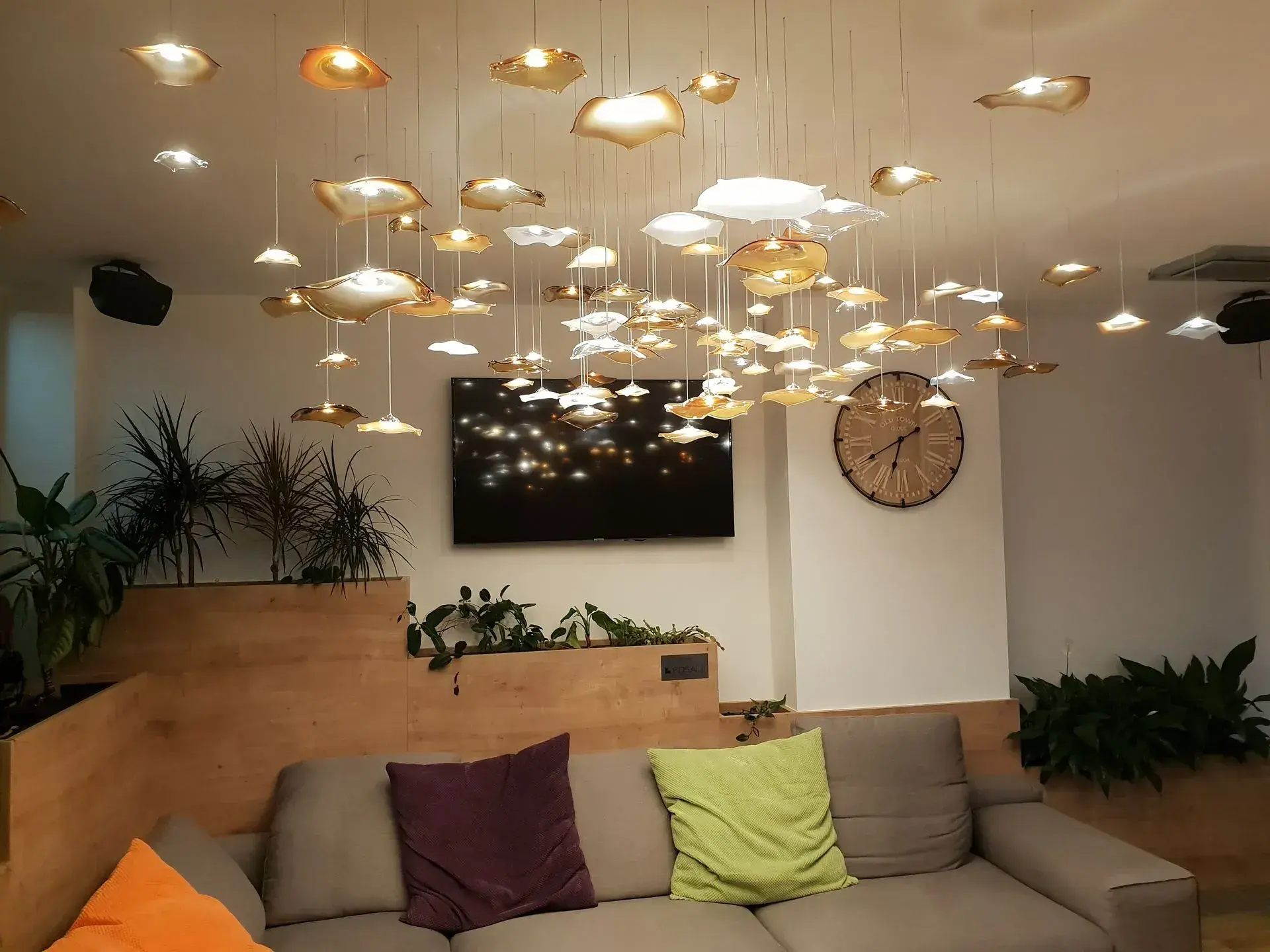 Lustra Infinito evocă ideea de lumină suspendată spre infinit — bucăți de sticlă suflate manual sunt agățate pe fibre optice foarte fine, creând impresia că plutesc în aer. Cu bază oglindită (opțiuni silver sau gold mirror) și variante personalizabile (dimensiune, finisaj), este perfectă pentru spații cu tavan înalt sau zone de preludiu, dar și pentru mese elegante în locuințe.
