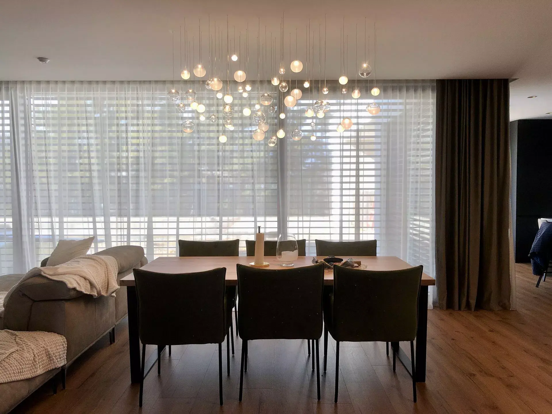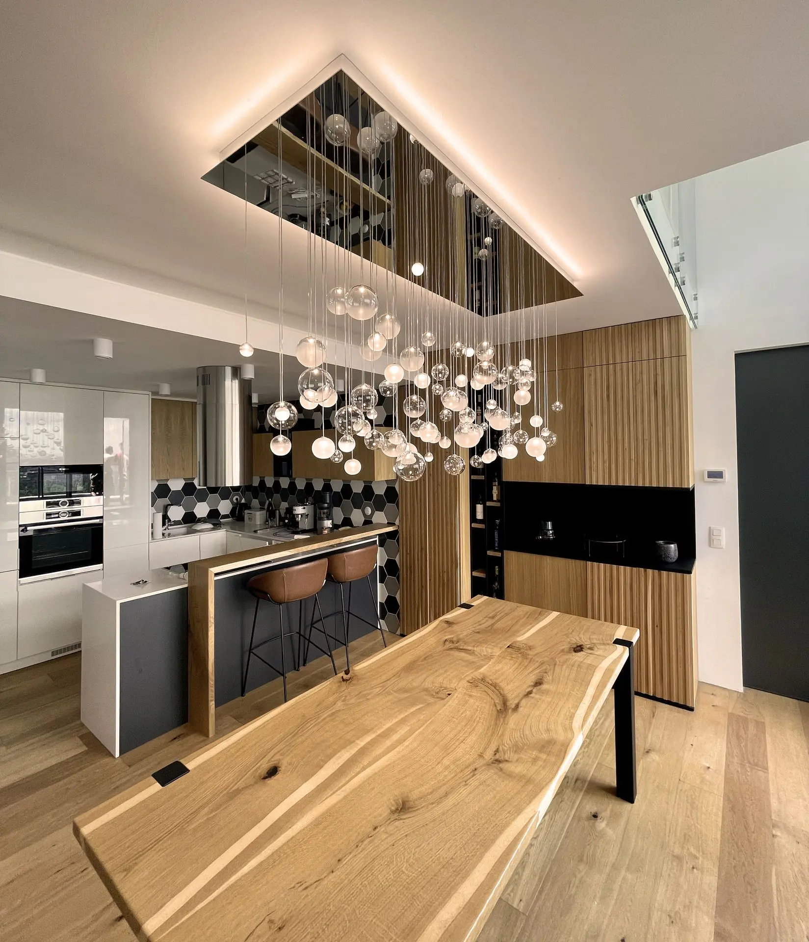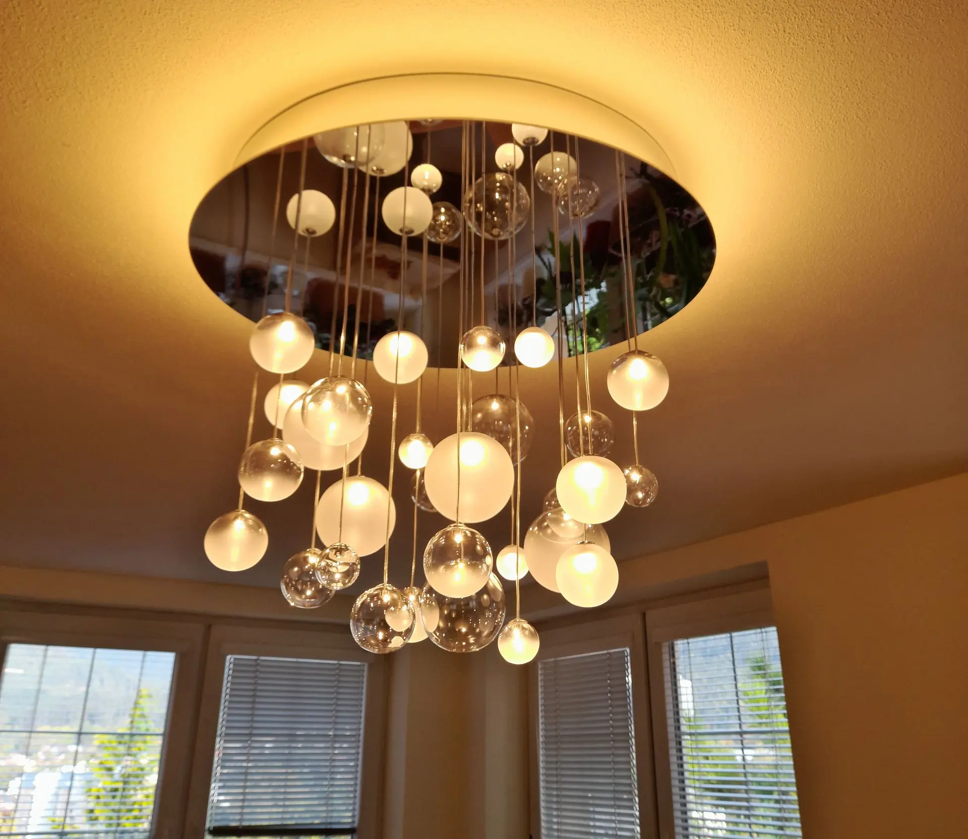 Lustra LURE este un model LED modern destinat spațiilor cu tavan înalt, alcătuit din piese de sticlă suflate individual, sablate manual, dispuse într-o compoziție valurită sau aleatorie care creează efecte luminoase poetice.