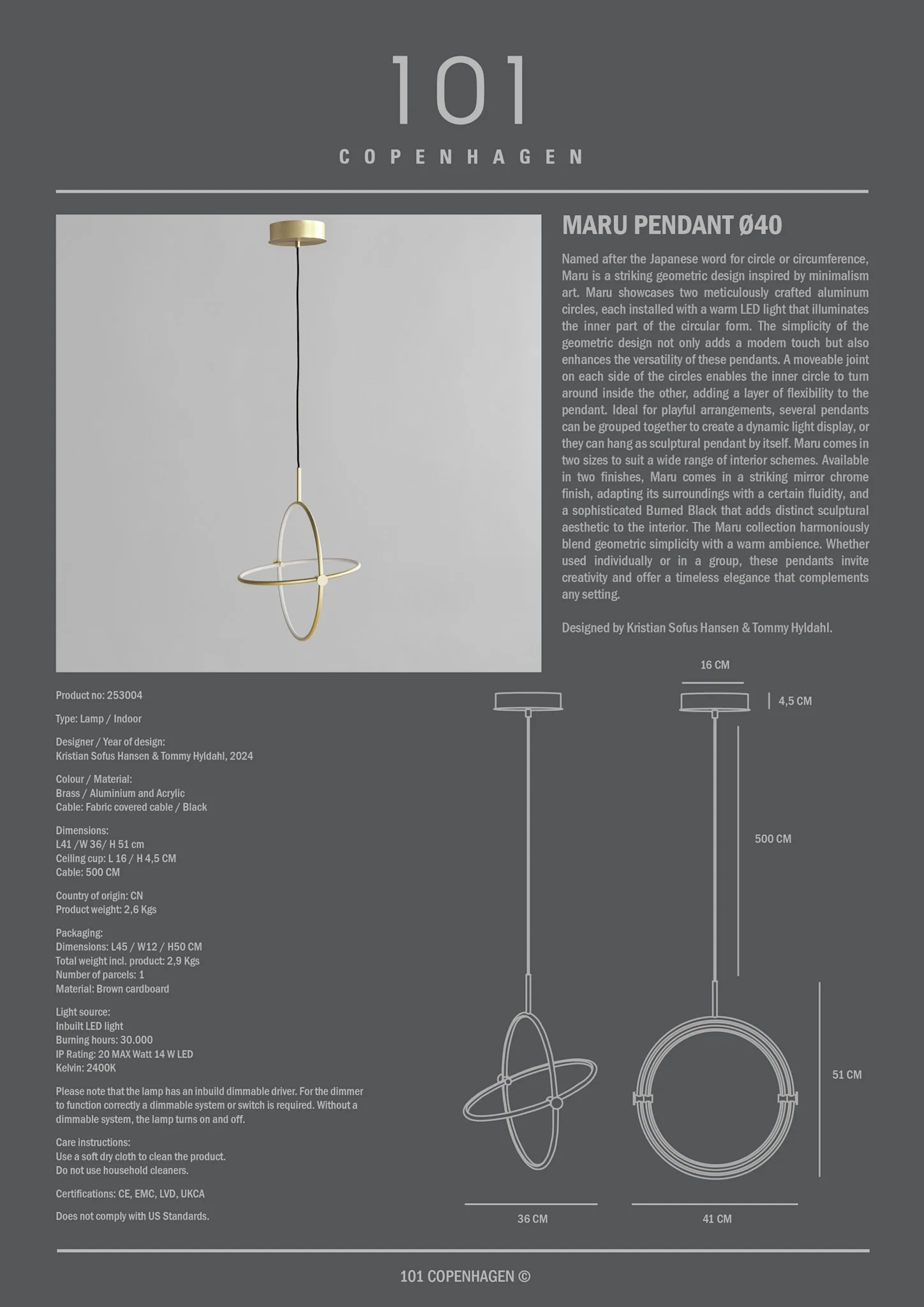 Lampa suspendată Maru Ø40 surprinde prin design geometric minimalist, alcătuit din două cercuri din aluminiu, fiecare dotat cu lumină LED ce iluminează partea interioară a formei circulare. Mecanismul articulat permite rotirea cercului interior în cadrul celui exterior, conferind flexibilitate și expresivitate compoziției. Realizată în finisaj alamă periată (brushed brass), adaugă căldură și rafinament spațiului.