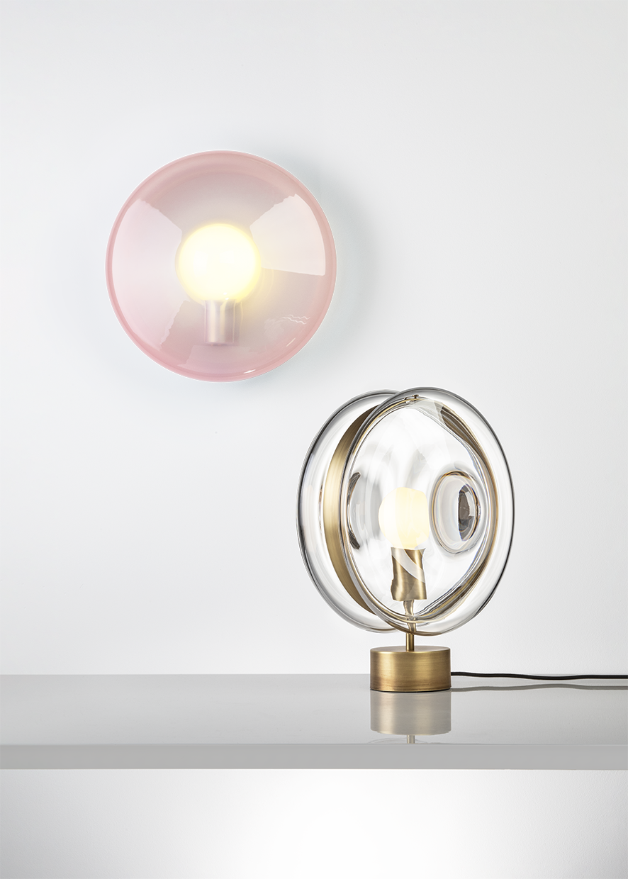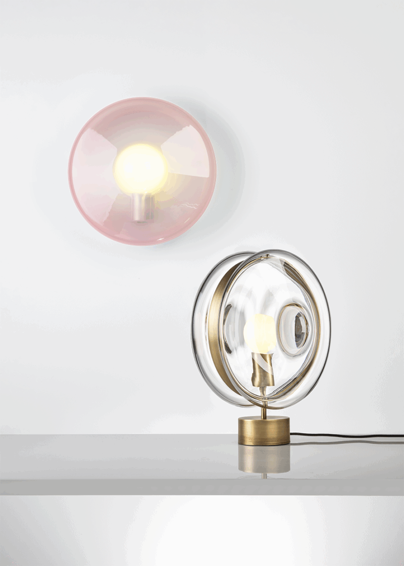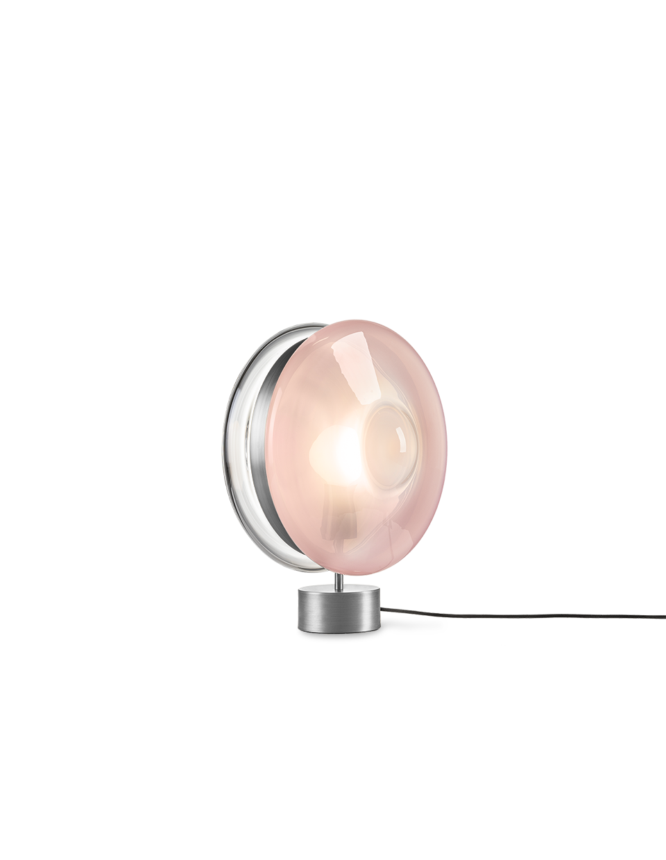 Lampa de masă Orbital, în nuanța Venus Pink cu detalii metalice brushed silver, combină cristalul suflat manual și finisajele metalice elegante, rezultând un obiect de iluminat sculptural și rafinat. Designul său subtil și sofisticat adaugă un accent artistic și luminos pe orice suprafață.