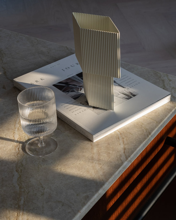 Romb Mini este o lampă de masă portabilă, cu design geometric sculptural şi textură ondulată — oferă un iluminat ambiental plăcut, oriunde dorești: pe comodă, masă sau terasa (cu atenție la depozitare).