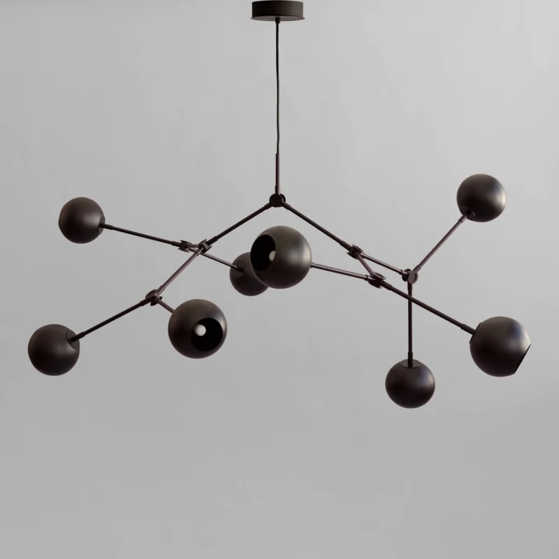 Lustra Sahn, cu cablu de 5 metri și finisaj bronz, evocă estetica futuristă a anilor ’70, redefinită prin design modern și flexibilitate structurală. Fiecare braț și abajur poate fi răsucit și orientat, permițând crearea unor forme luminoase adaptate spațiului și gustului utilizatorului.