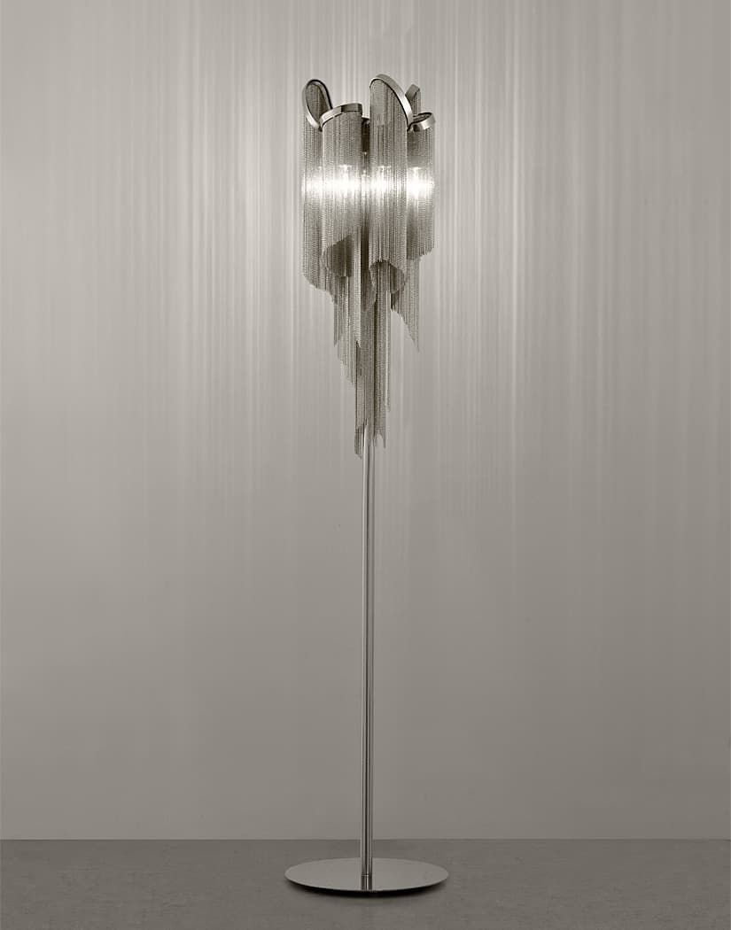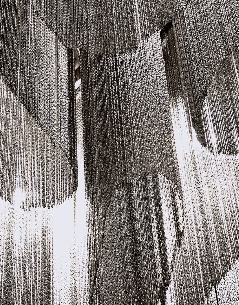 Colecția STREAM, semnată de designerul Christian Lava, este o adevărată sculptură luminoasă ce combină eleganța materialelor cu efectul vizual impresionant al lanțurilor fine de metal care par să „curgă” din cadru. În concepția sa, peste “7 kilometri” de lanțuri metalice par suspendate dintr-o structură ondulată, creând un joc de lumini și umbre ce definește întreaga încăpere.